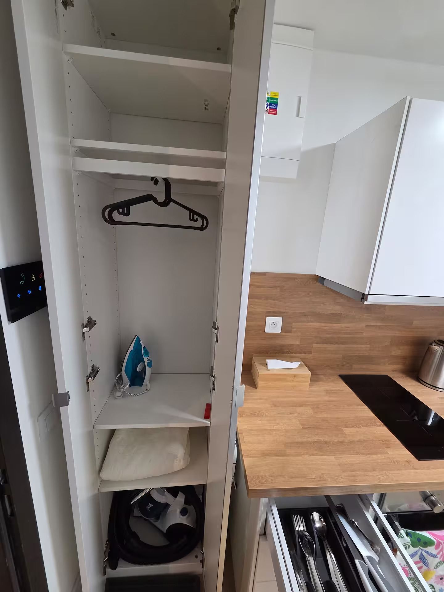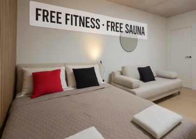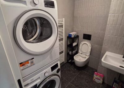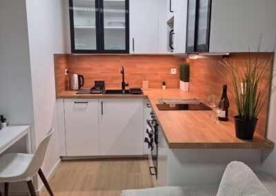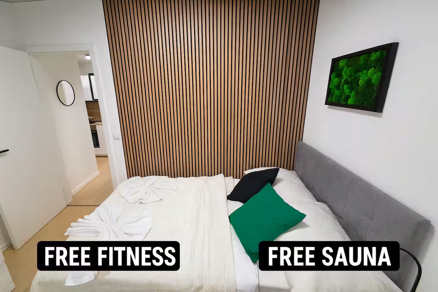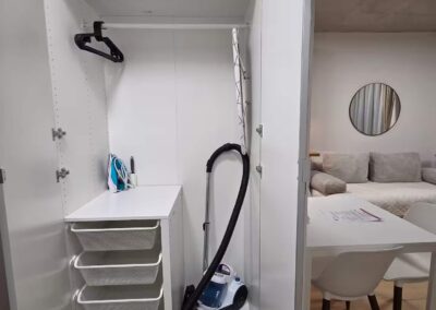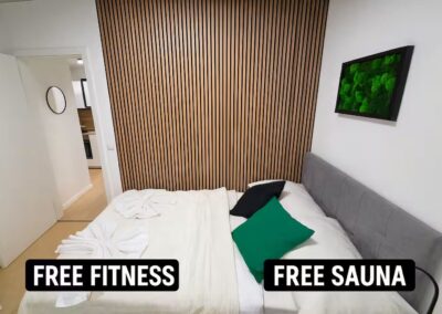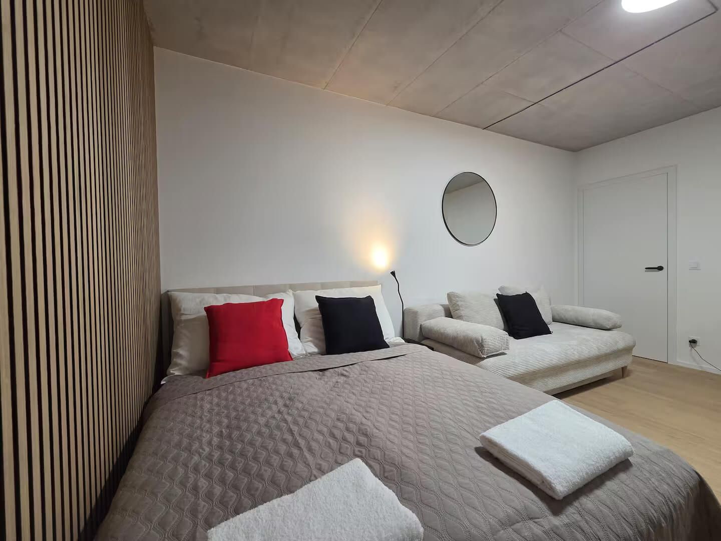 The kitchen is equipped with standard appliances and utensils – dishwasher, microwave, toaster, glass-ceramic hob, oven, washing machine, etc. In the bathroom with a shower, you will find a hairdryer and toiletries. The bedroom features a double bed (separate beds available upon request), a sofa bed, an LCD TV, and a work desk.
